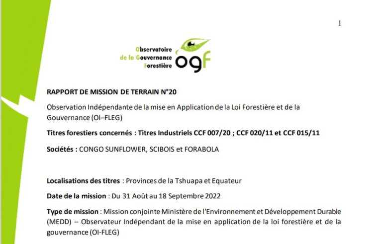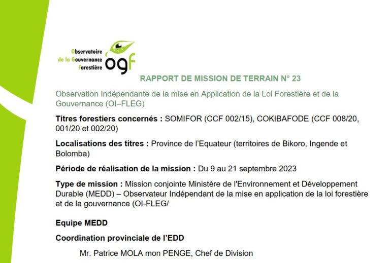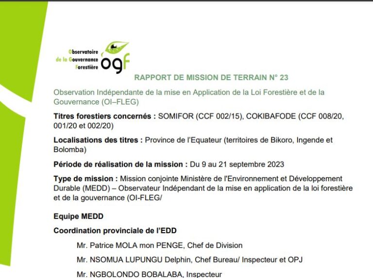 L’observatoire de la gouvernance forestière (OGF) a effectué une mission conjointe de contrôle forestier du 9 au 21 septembre 2023 dans la province de l’Equateur en République Démocratique du Congo (RDC). Cette mission diligentée par le gouverneur de province suite à la correspondance de la Coordination provinciale de l’Environnement de la Province de l’Equateur sollicitant à l’Observatoire de la Gouvernance Forestière en date du 18 août 2023 un appui technique et financier pour une mission de contrôle forestier et installations dans la province. Mais également aux multiples dénonciations des organisations de la société civile environnementale concernant des exploitants forestiers industriels, en l’occurrence Société Millénaire Forestière (SOMIFOR) (002/15), CONGO KING BAISHENG DEVELOPEMNT FORESTRY (001 et 002/20, 008/20).