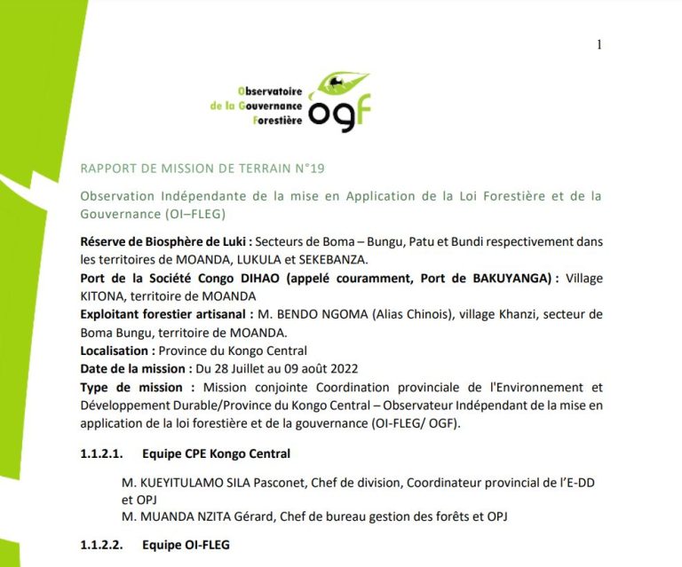 Suite aux informations rapportées par certaines organisations de la société civile sur des cas d’exploitation illégale de bois d’œuvre observés dans la Réserve de Biosphère de Luki et leur souhait de connaitre la nature des opérations qui se font dans le port de la société précitée, l’ONG Observatoire de la Gouvernance Forestière OGF a saisi la coordination provinciale de l’environnement du Kongo Central pour obtenir l’autorisation du ministre provincial chargé de l’environnement pour agréer une mission conjointe d’investigation. Il s’agit notamment des rapports des missions de l’ONG partenaire CEPECO qui travaille depuis plusieurs années dans cette province.